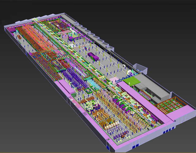 (7)对奥迪二总装车间内部土建和工艺设备全方位扫描,得到完整的彩色点云,无缺失、无破面、不失真,并对全部土建、部分生产线和设备进行建模,包括建筑结构水暖动电、工艺设备、辅具等;