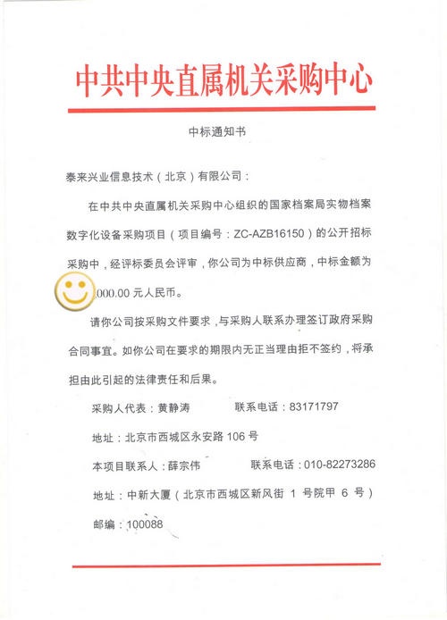 近日,泰来公司收到中共中央直属机关采购中心的中标通知书,在中华人民共和国国家档案局实物档案数字化设备采购项目中,泰来兴业信息技术(北京)有限公司,凭借先进、完善的整体解决方案,在众多国际品牌公开竞争中,赢得评委专家及用户的一致认可,最终中标。泰来公司将为国家档案局提供成熟、完善的售后服务及技术支持工作。