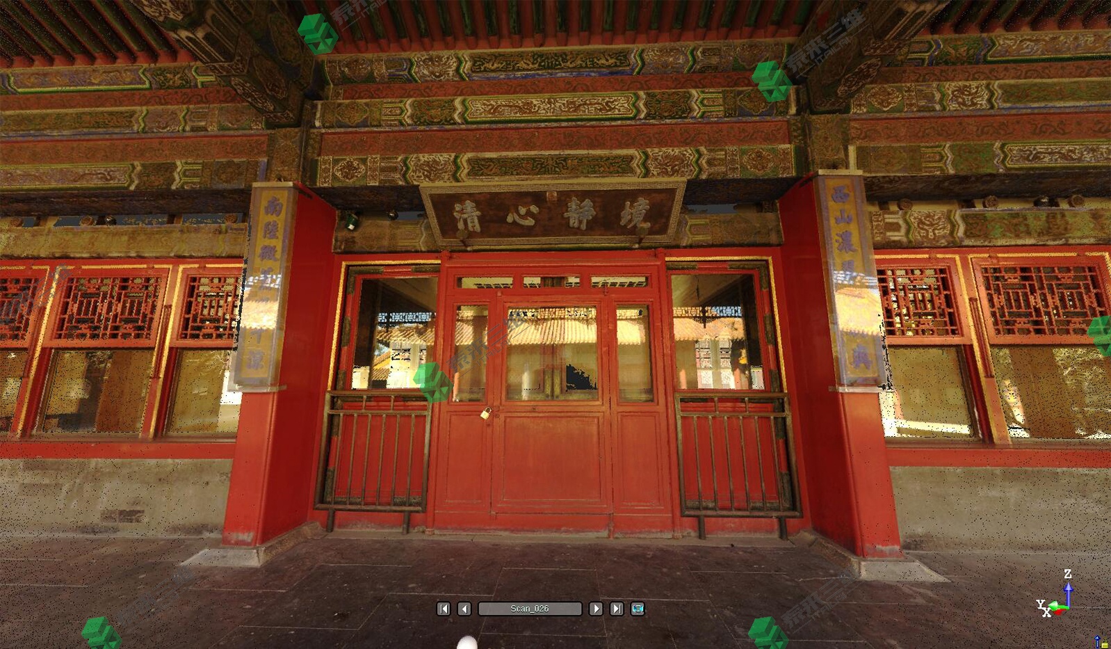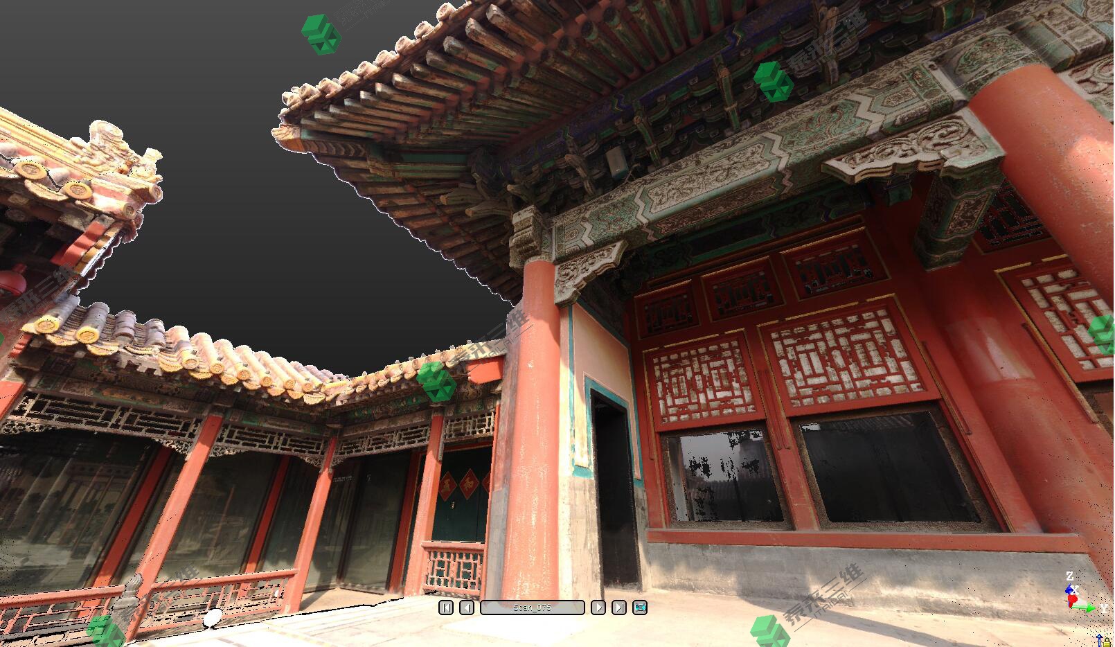 古建筑三维数字化的起点是数据的获取。目前基础数据的获取方法主要有:1)传统的方法,组织大规模人力现场采集测量,积累了大量的古建筑工程测绘图纸和文档资料。2)随着数码摄影的广泛使用,利用数码摄影技术记录古建筑的二维影像也是基础数据的来源之一。3)随着三维扫描技术的不断发展完善,对古建筑进行非接触式三维扫描来获取古建筑的三维点云数据。