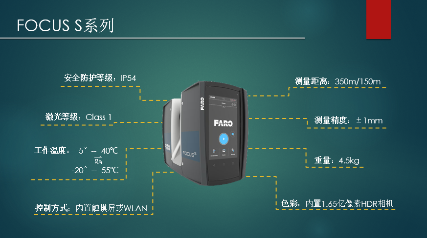 Focus S350 是法如受欢迎的,简约轻便且直观的产品线中的新产品,这个系列的设备是现在市场上有远见的三维激光扫描仪,增加了多种以客户为中心的特色功能,如IP防护等级(IP54)、扫描精度、和范围增加,内部附件接口和内置的现场补偿等等.