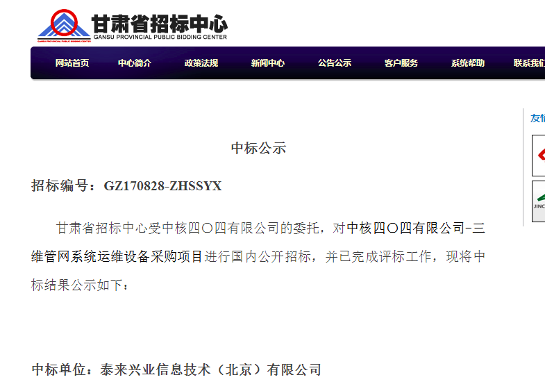 近日,泰来公司在甘肃省招标中心组织的中核四0四有限公司三维官网运维系统设备招标项目中,依靠成熟完善的三维立体解决方案和国际领先的三维激光扫描设备、地下管线探测设备及全球定位系统,赢得专家及用户认可,最终中标。泰来将为用户提供完善的技术支持工作。