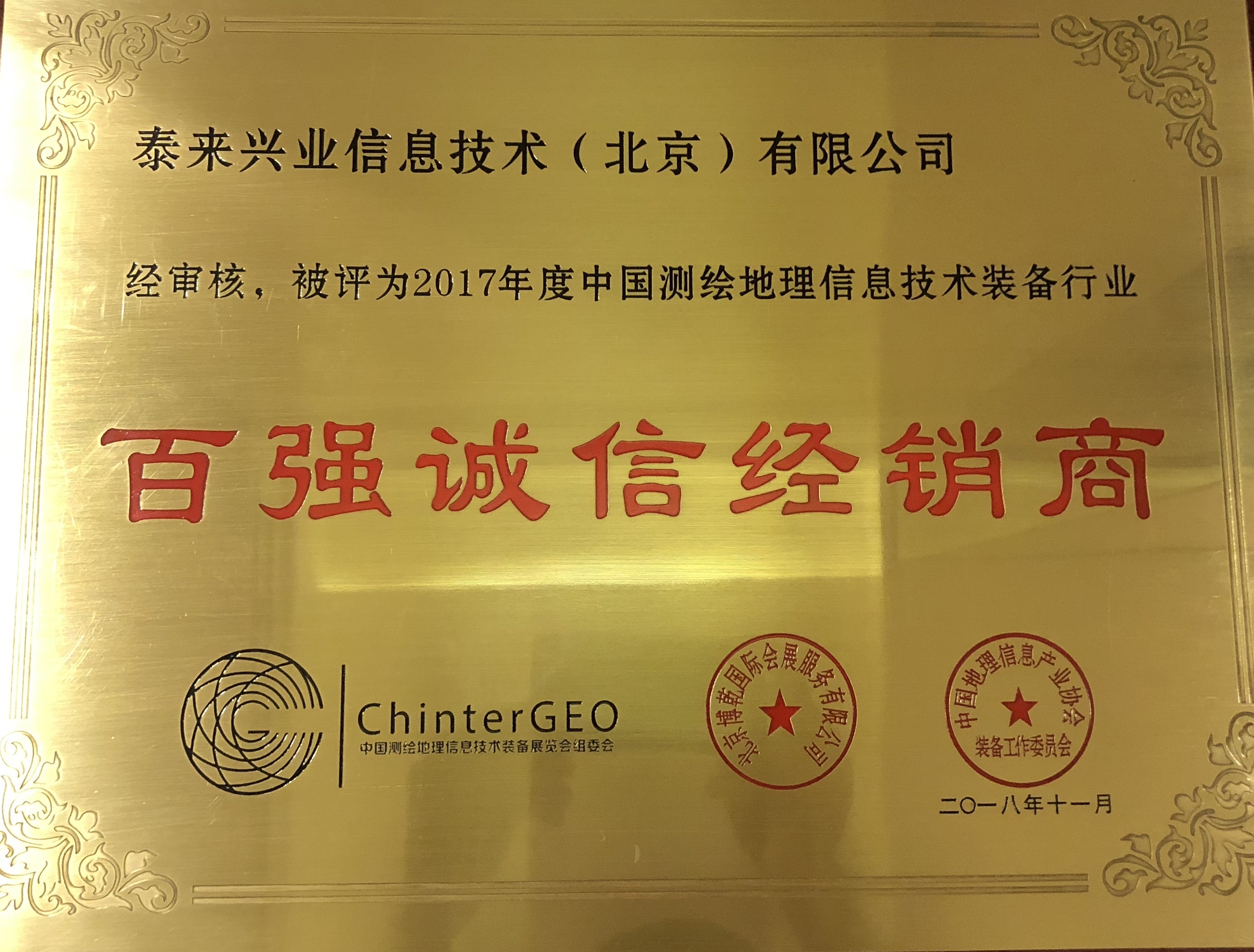 泰来荣获2017年度中国测绘地理信息行业“百强诚信经销商”称号