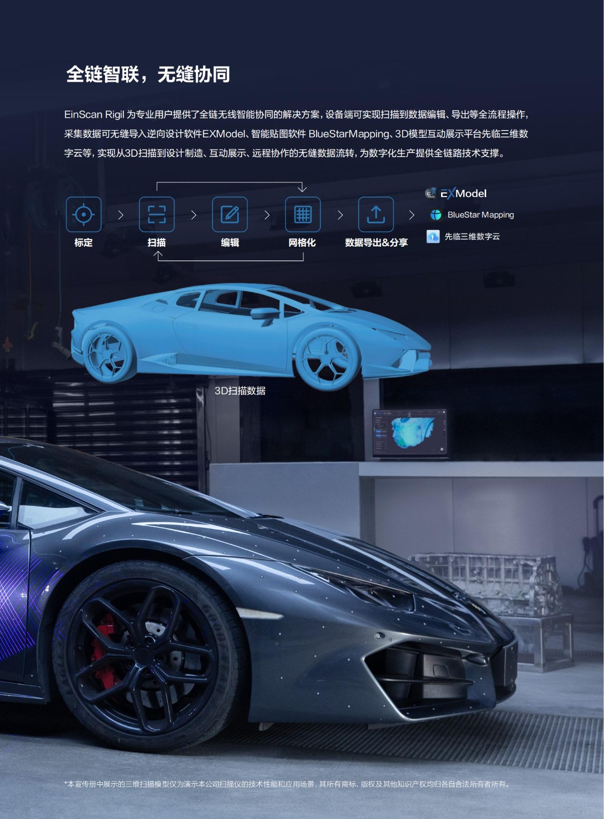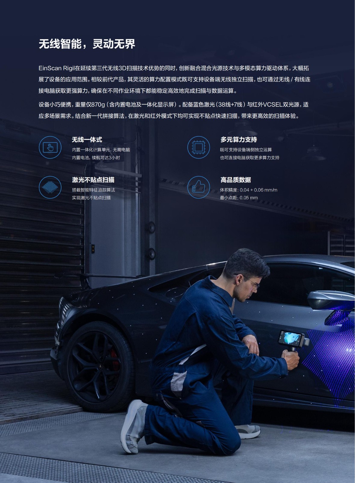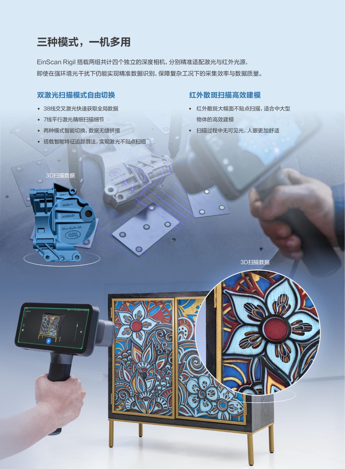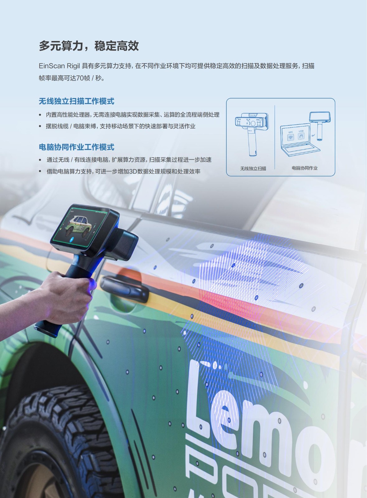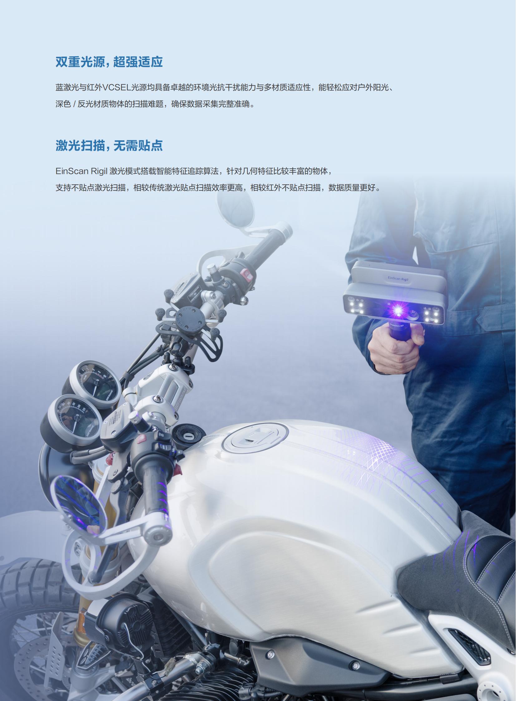 产品简介:EinScan Rigil是先临在延续无线扫描三代技术优势的同时,创新融合混合光源技术与多模态算力驱动体系,大幅拓展了设备的应用范围。相较前代产品,其灵活的算力配置模式,既可支持设备端无线独立扫描,也可通过无线/有线连接PC获取更强算力,确保在不同作业环境下都能稳定高效地完成扫描与数据运算。